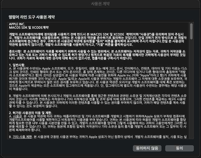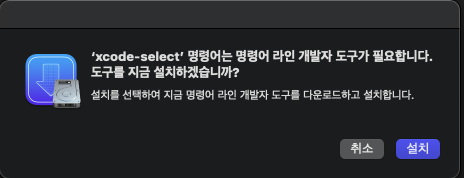 아래와같이 xcode-select 명령어는 명령어 라인 개발 도구가 필요합니다. 도구를 지금 설치하겠습니까? 라는 얘기가 뜨고